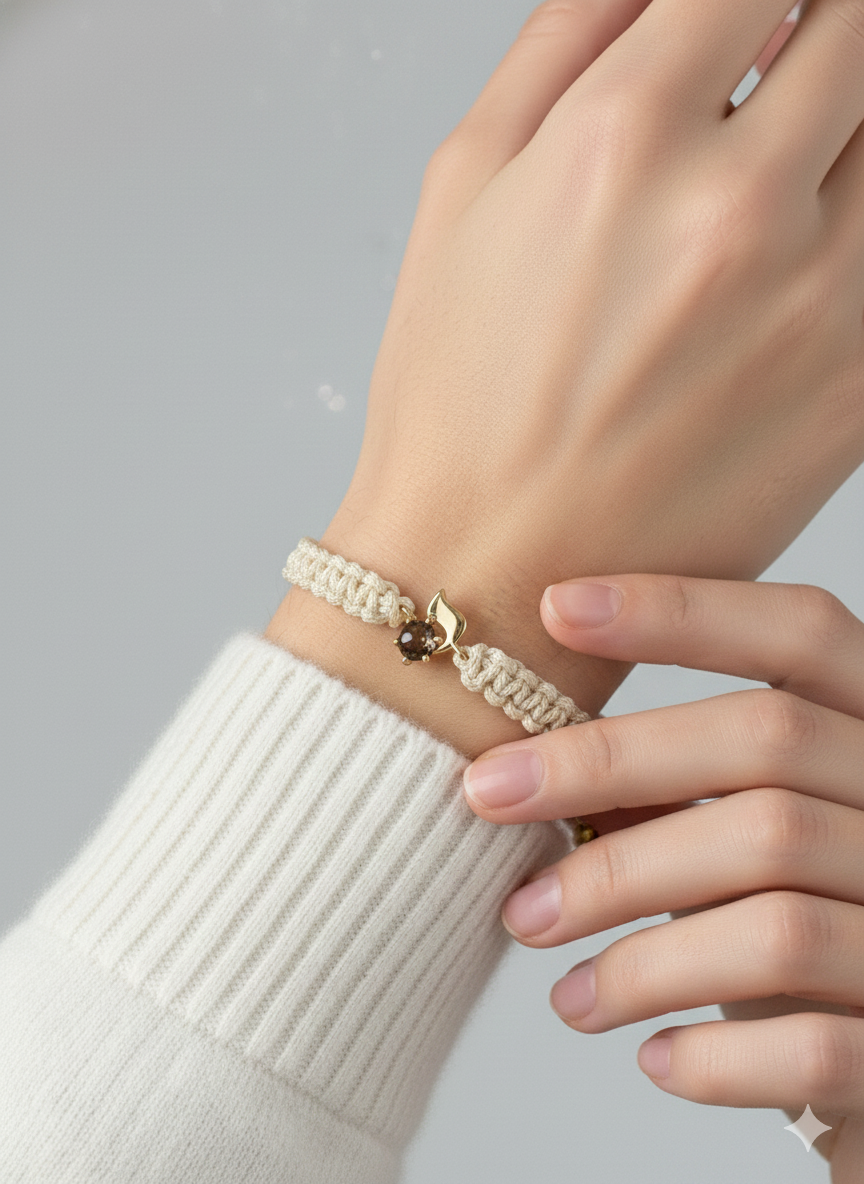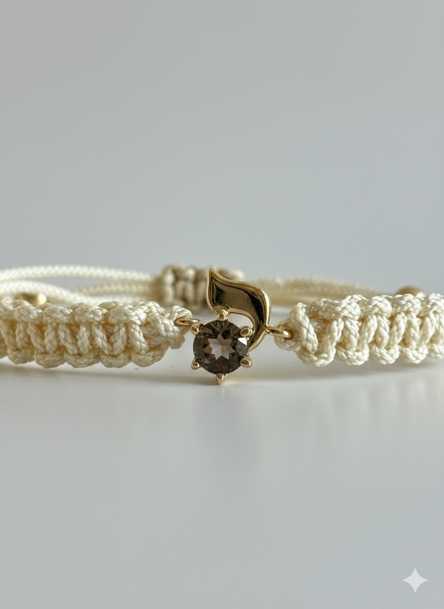 This bracelet features a 14K gold YOD, paired with a smoky quartz accent and hand-finished Japanese silk cord, known for its strength and tactile softness.