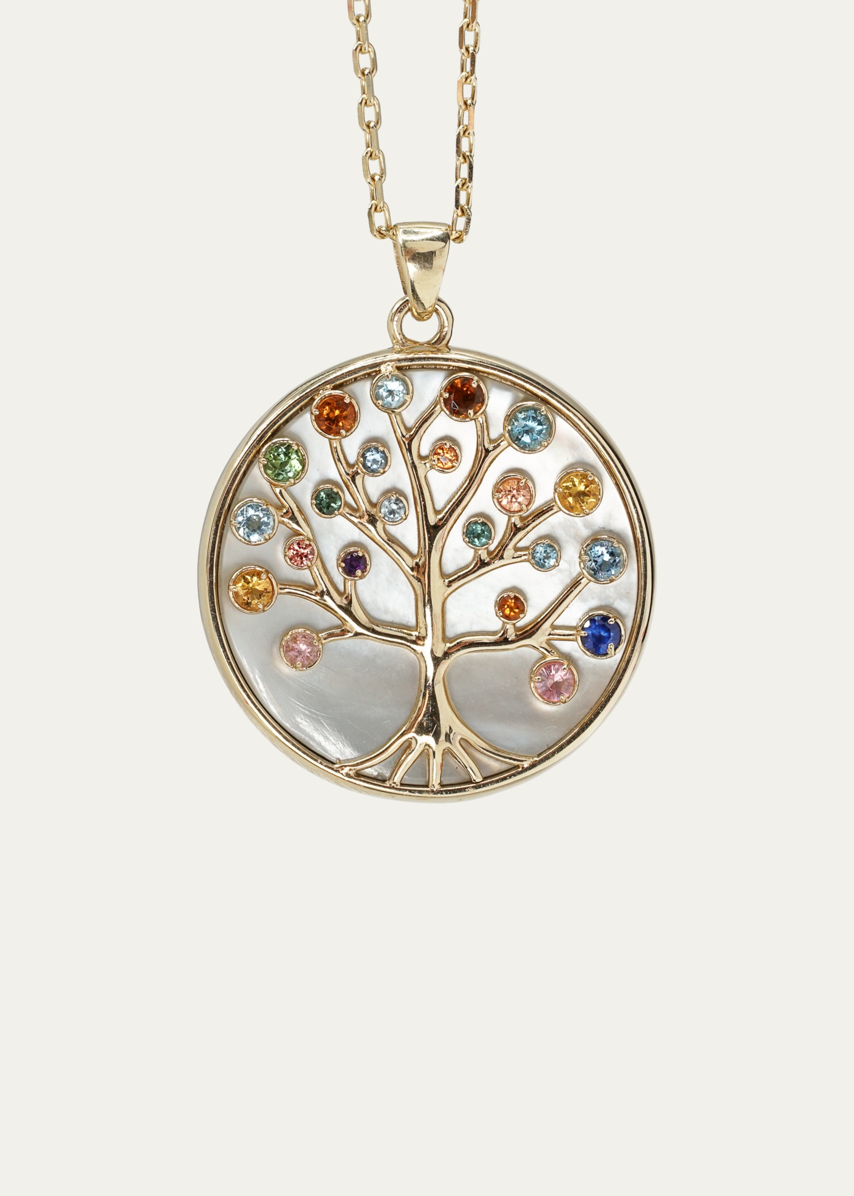 The Tree of Life Medallion Necklace translates this ancient archetype into a sculptural medallion, where branching forms unfold in solid 14k gold over a luminous mother of pearl base. Each branch is set with carefully selected sapphire, aquamarine, and tourmaline gemstones, creating a harmonious constellation of color, light, and meaning.