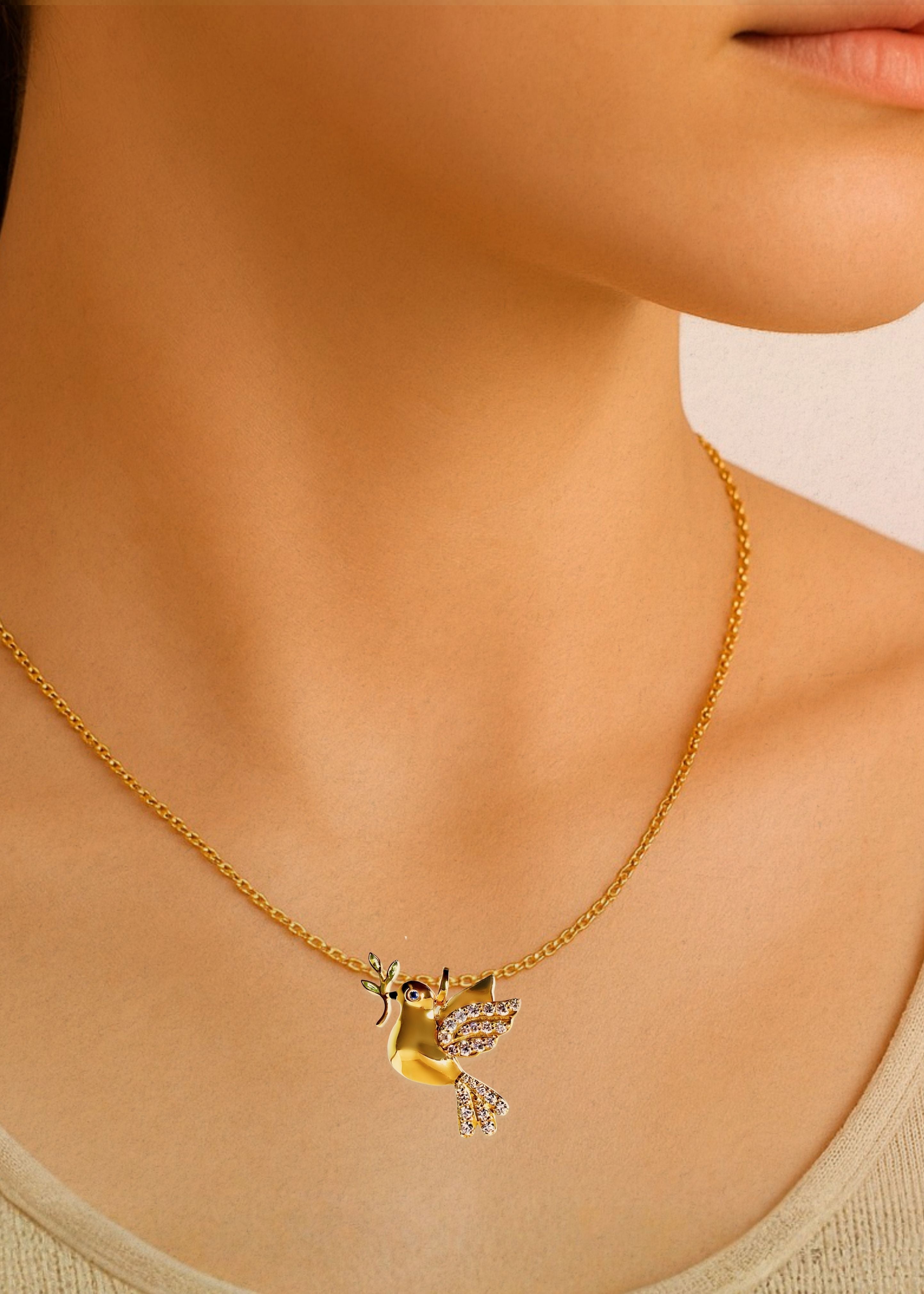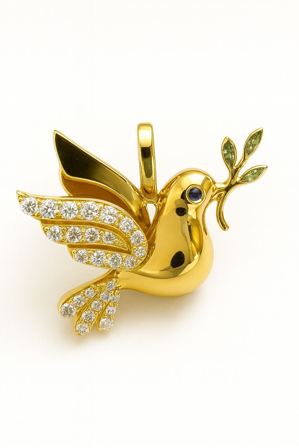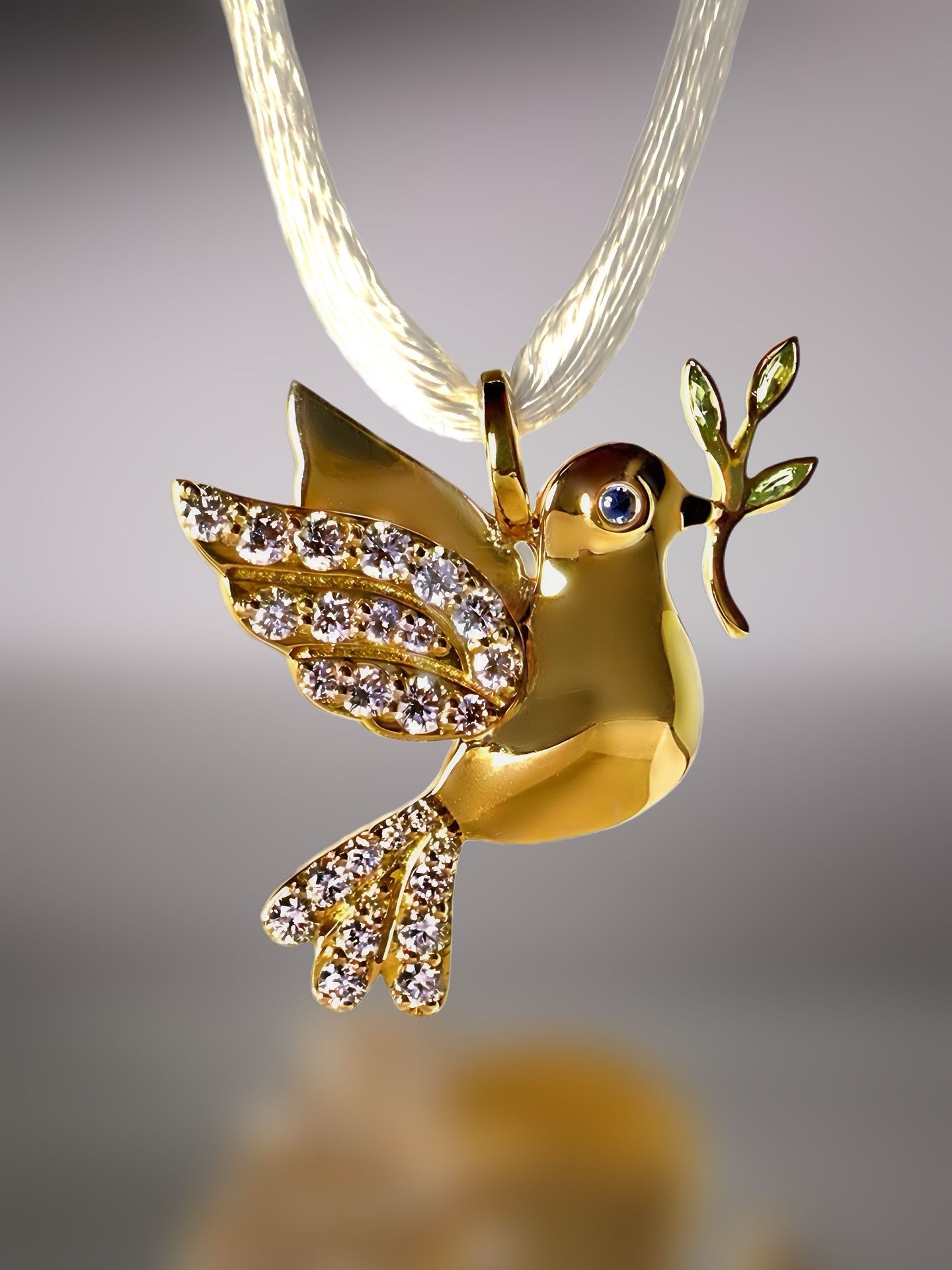 18K Yellow Gold Dove Pendant, 0.52ct Round Brilliants, Blue Sapphire Eye, Tsavorite Leaves